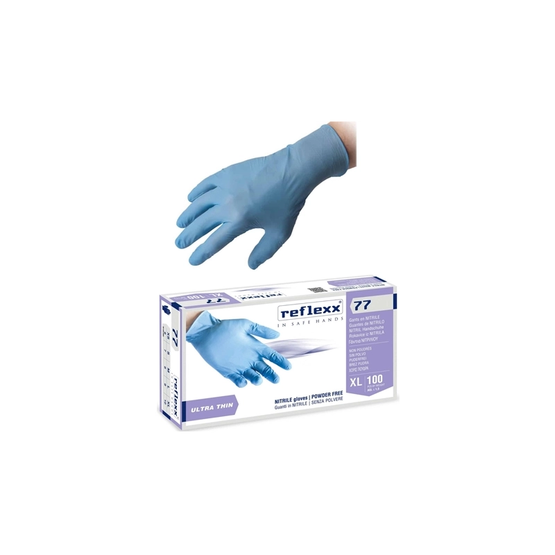 Guanti in nitrile monouso senza polvere. Ambidestri 100% latex free. Ultra sottili per una sensibilita' massima e una buona resistenza grazie alla elevata qualita' del materiale impiegato. L'assenza di polvere riduce anche il rischio di contaminazione e dermatiti. Finitura microruvida. AQL 1,5. Spessore mm 0,06. Lunghezza 24 cm. Colore azzurro. In confezione da 100 pezzi. Modello = taglia