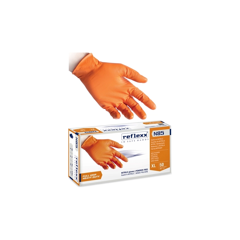 Guanti in nitrile monouso senza polvere. Ambidestri, 100% Latex Free. Grip su tutto il palmo e le dita per una presa ottimale. Alta resistenza per lavori pesanti. AQL 1,5. Spessore mm 0,18. Lunghezza 24 cm. Colore arancio. In confezione da 50 pezzi. Modello = taglia