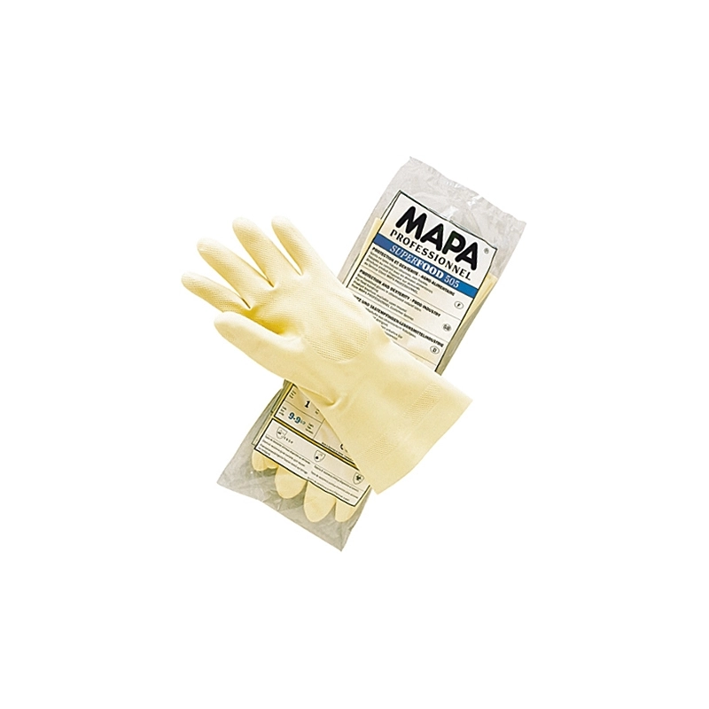 Guanti impermeabili in lattice. Interno liscio ed esterno con rilievi antiscivolo. Lunghezza 31 cm, spessore 0,4 mm. Adatto per contatto con alimenti, usato nel settore agroalimentare e pulizie industriali. Modello = taglia