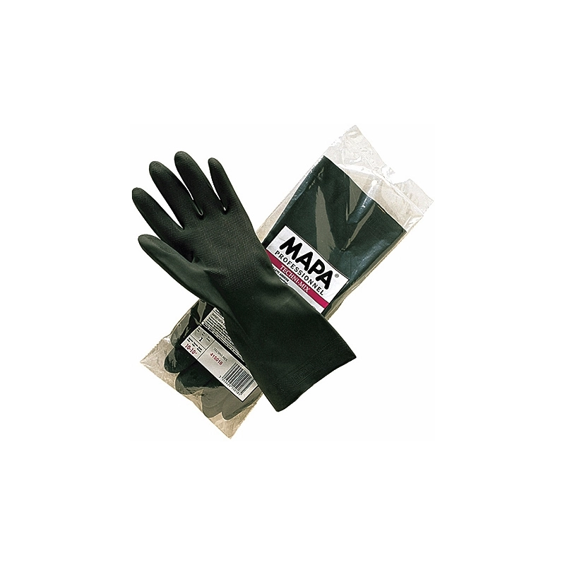 Guanti impermeabili in lattice misto neoprene, interno floccato, esterno zigrinato antiscivolo. Lunghezza 32 cm, spessore 0,6 mm. Adatti per pulizie industriali, manutenzione ed edilizia. EN388-1011X. Colore nero. Modello = taglia