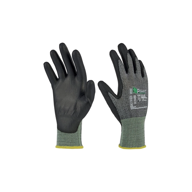 Guanti con spalmatura in Pu-Foam che garantisce grande destrezza e traspirabilita' evitando la sudorazione delle mani. Fodera in nylon e HPPE. Touchscreen. Antitaglio B con protezione contro i rischi meccanici e termici. Colore grigio/verde. EN388:4X42B. EN407:X1XXXX. Modello = taglia
