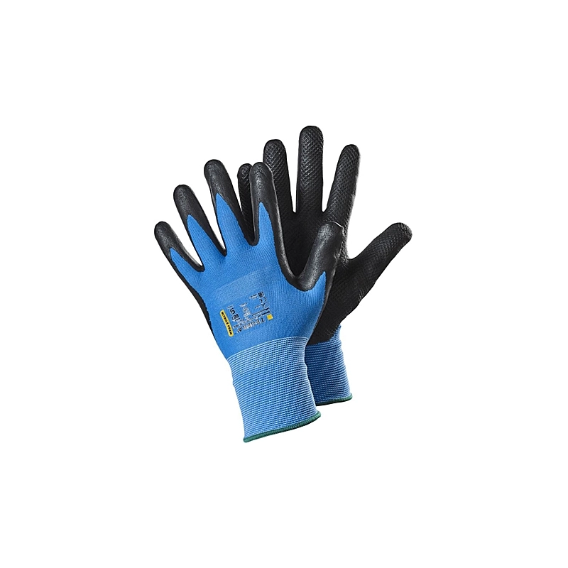 Guanto in foam di nitrile. Supporto in Lycra, nylon 13 aghi. Palmo idrorepellente e oleorepellente. Grip rinforzato. Adatto per ambienti scivolosi e oleosi. EN388:2016-4132X. Colore nero e blu. Modello = taglia