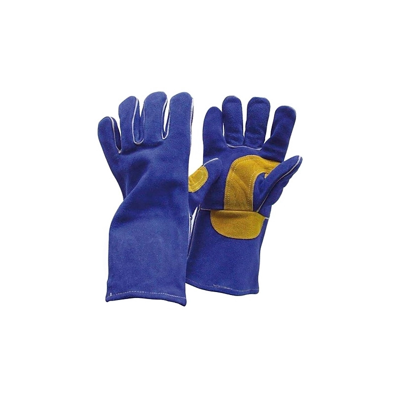 Guanti professionali in pelle per saldatore. Colore blu. Interamente foderato in tessuto cotone, palmo e piega pollice parzialmente rinforzato in crosta gialla, cuciture in filato Kevlar.