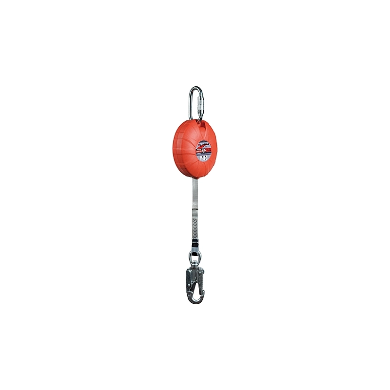 Dispositivo retrattile dotato di cinghia in poliestere e di un carter di protezione in nylon rinforzato con fibra di vetro. Connettore di base con bloccaggio TWIST (ghiera a 2 movimenti). Connettore di terminazione con sistema doppio SWIVEL antiattorcigliamento della cinghia. Resistenza della cinghia 15 kN. EN 360:2002. Lunghezza del nastro 6 mt