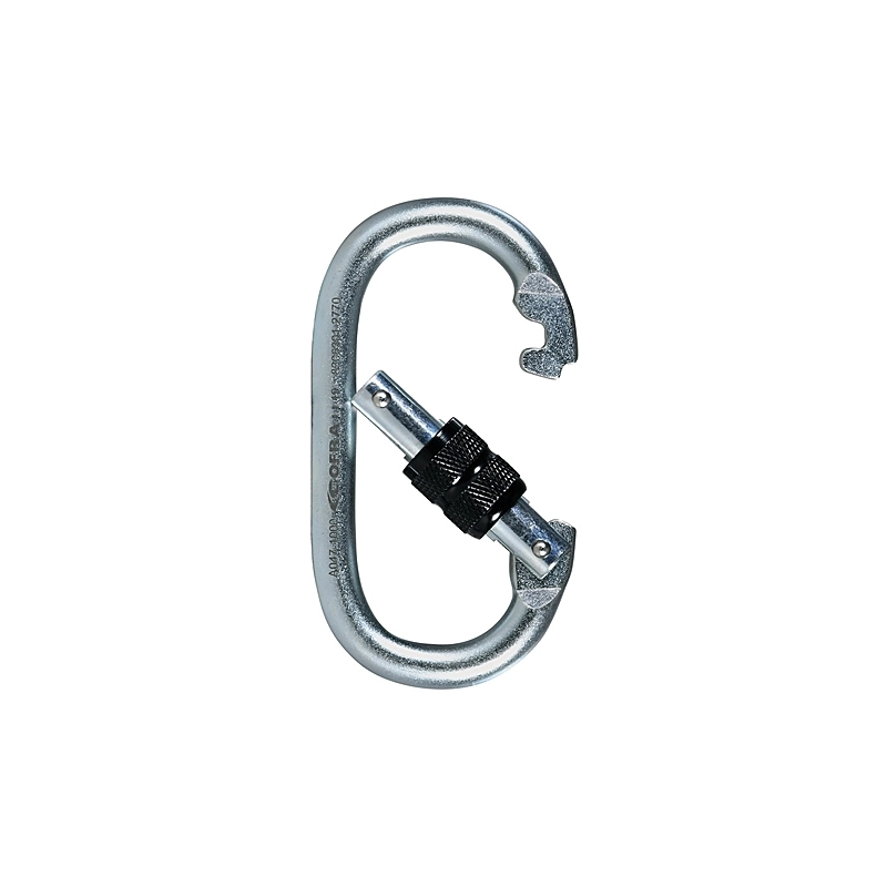 Moschettone in acciaio zincato con bloccaggio SCREW - ghiera a vite. EN 362:2004. Apertura 18 mm. Dimensioni 108x59 mm.