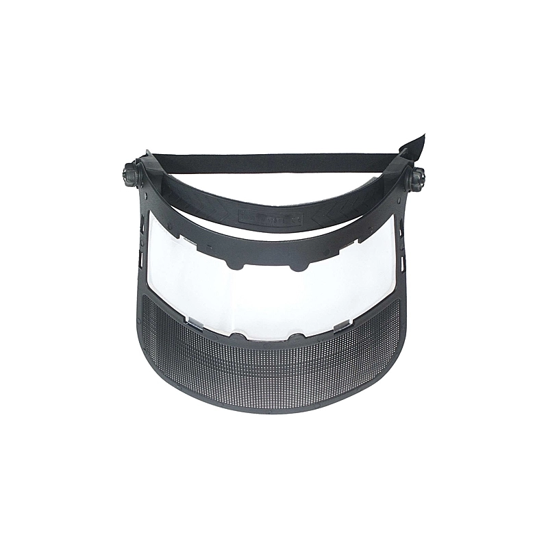 Testina parasole regolabile, con fori per l'areazione. Ampia visiera combinata policarbonato e rete. Striscia in spugna antisudore. Policarbonato sostituibile