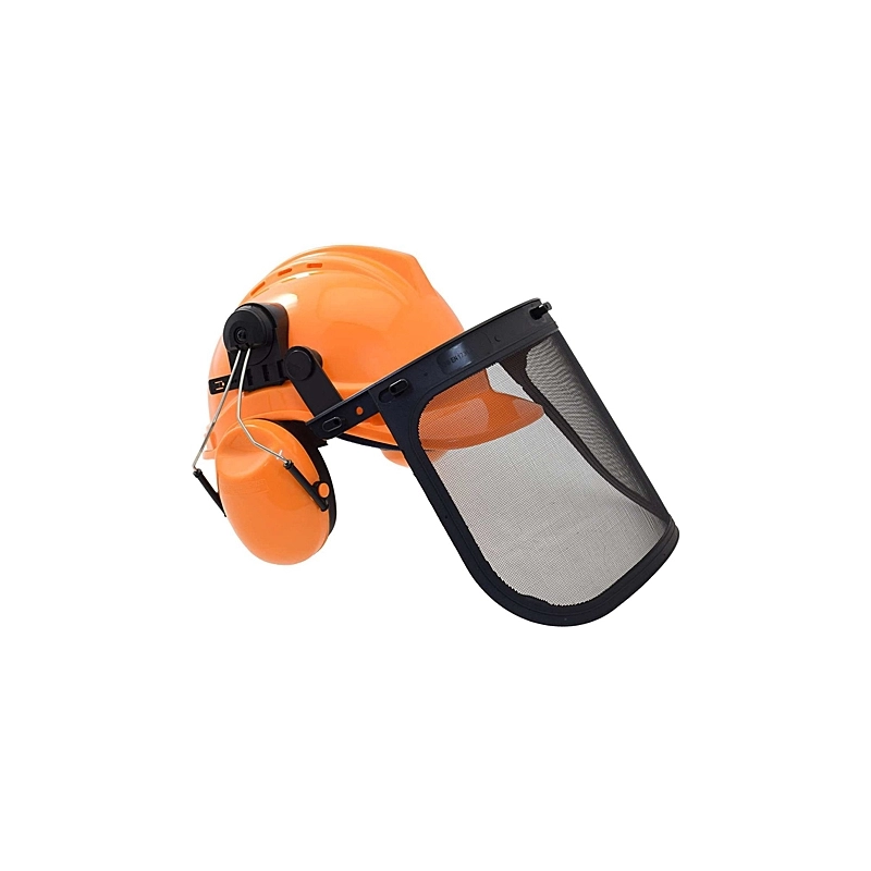 Casco in polietilene ad alta densita'. Cuffie antirumore applicate al caschetto. Visiera di protezione con rete metallica.