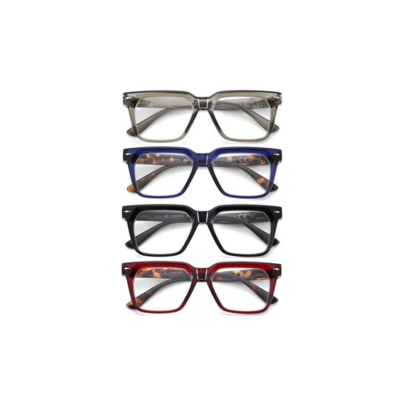 Occhiali per lettura. Aste flessibili. Lenti asferiche, sottili e infrangibili, con trattamento antigraffio e antiriflesso. Confezione da 4 pz (blu-tartaruga, rosso-tartaruga, nero e grigio). Modello = correzione diottrie