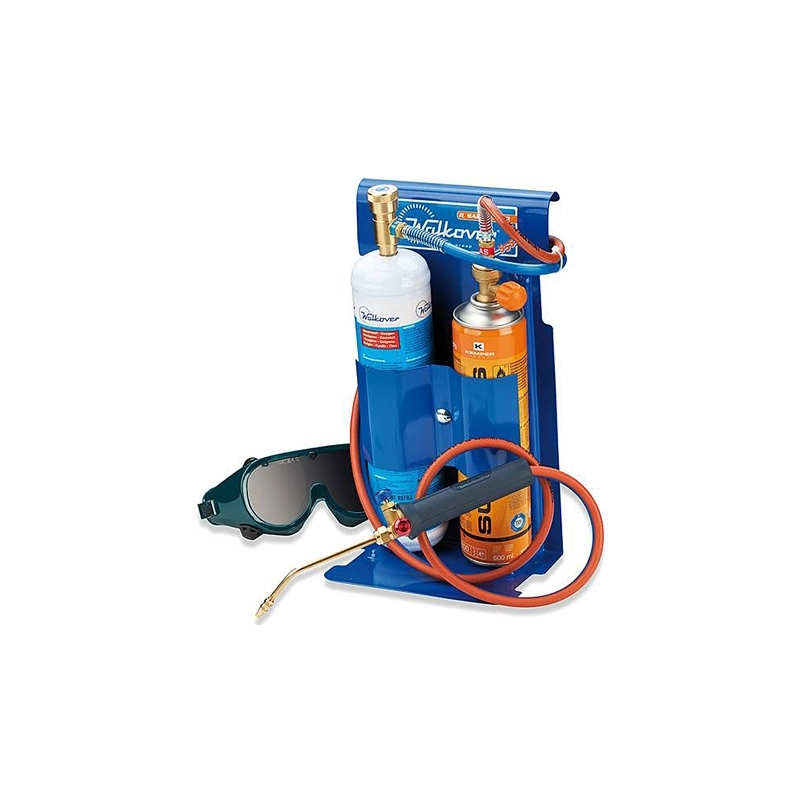 Kit composto da: riduttore di pressione ossigeno, valvola regolazione gas, valvole antiritorno, tubi da 1,5 m, cannello con due punte diametro 0,5 e 0,65, occhiali, struttura, bombola di ossigeno e bombola di supergas con attacco 7/16'. Utilizzabile con bombola di Novacet.