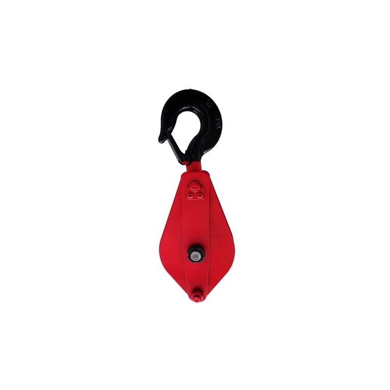 Taglie con gancio girevole non apribili a 1 ruota in ghisa. Adatte per funi in canapa, uso manuale. Modello = Portata kg/Diametro ruota mm
