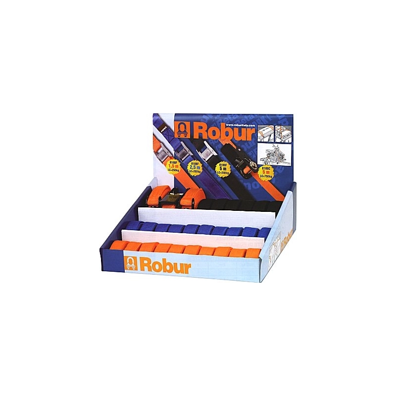 Espositore cinghie in polipropilene. Larghezza mm.25. 10 pezzi m 1,5 con fibbia, 10 pezzi mt.2,5 con fibbia, 6 pezzi mt 5 con fibbia, 3 pezzi m 5 con cricchetto