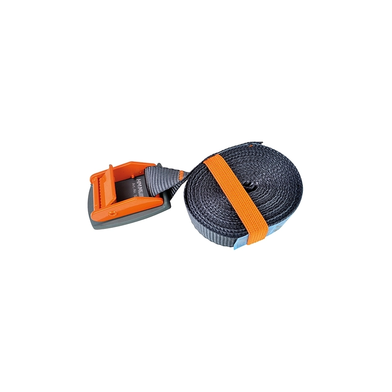 Cinghia ancoraggio con fibbia dotata di protezione in gomma. Nastro da mm 25. Elastico per fissare il riavvolgimento. Base in gomma per proteggere la carrozzeria dell'auto. Modello = lunghezza mt