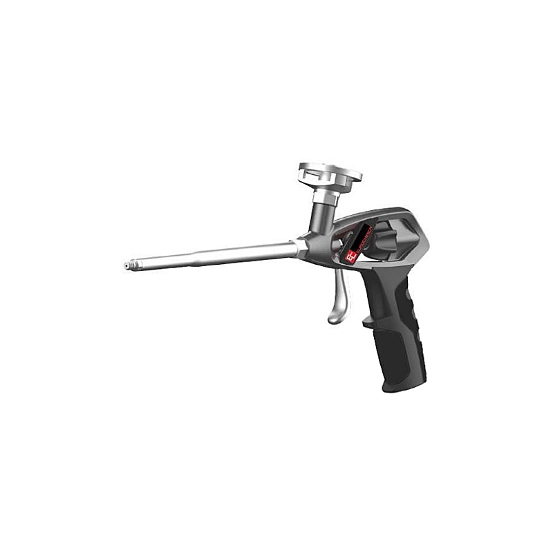 Pistola per schiuma poliuretanica adatta a tutti i tipi di bombolette di schiuma in commercio. Pratica manopola di regolazione, utilizzabile ad una sola mano. Parte superiore in pressofusione di alluminio color canna di fucile, mentre l'impugnatura e' in polipropilene con rivestimento in gomma termoplastica. Include cannucce in plastica.