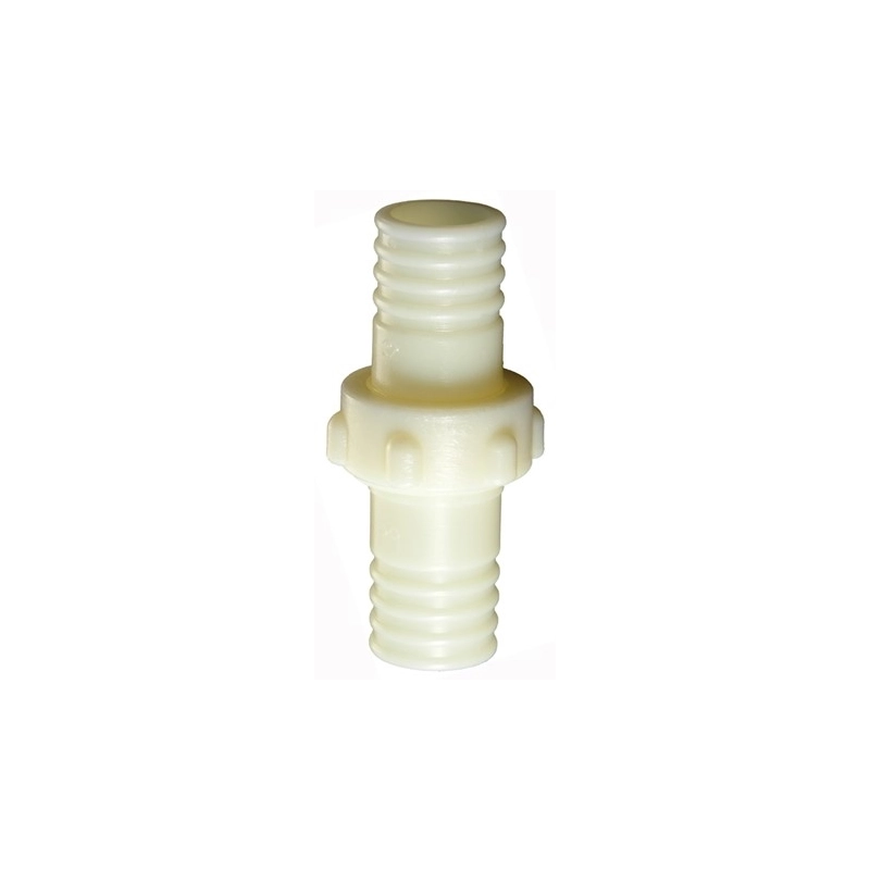 Giunto portagomma diritto in tre pezzi con accoppiamento conico e connessione tubo DN. In plastica poliammide PA66 colore naturale. Pressione max di esercizio 10 bar a 20 gradi C. Modello = diametro tubo x diametro tubo mm