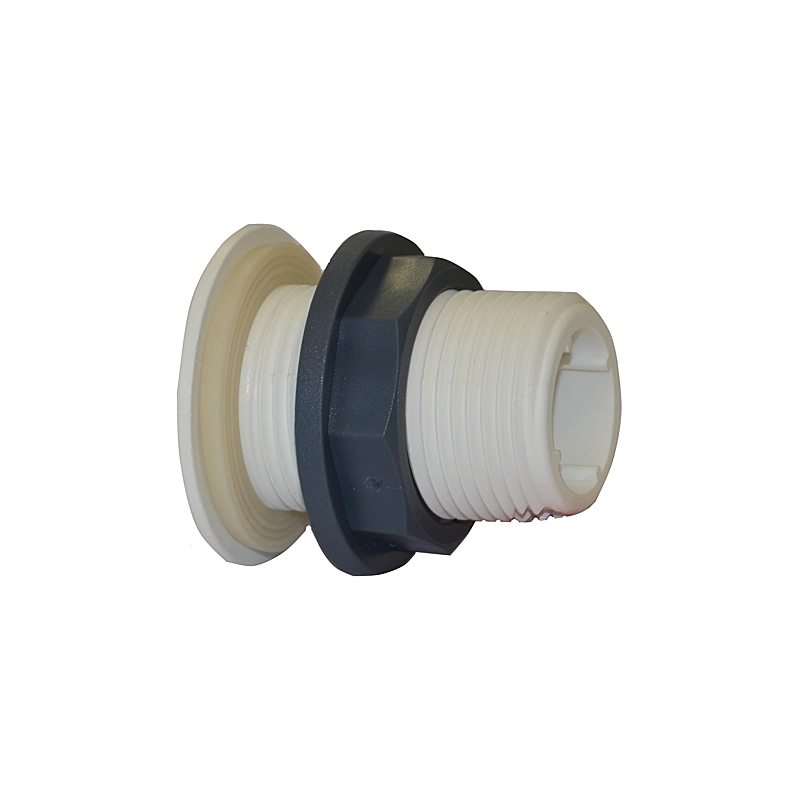 Attacco per serbatoio maschio munito di collare di serraggio e guarnizione piana in EPDM. Spessore guarnizione 3,5 mm. Filettatura esterna cilindrica UNI ISO 228/1. Colore grigio e bianco. Modello = attacco pollici