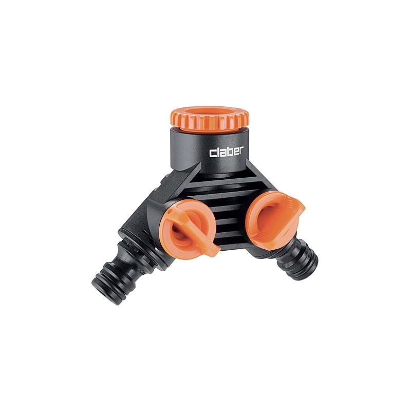 Consente di collegare due tubi ad un rubinetto. Raccordo con valvole per rubinetti da 3/4'' con riduzione da 1/2''. Compatibile con i raccordi automatici quick-click. Modello = confezione