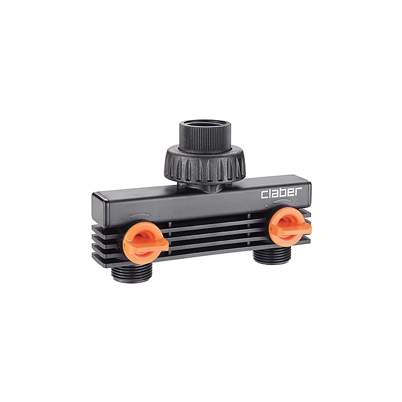 Consente di collegare due tubi ad un rubinetto. Raccordo con valvole per rubinetti da 3/4''. Modello = confezione