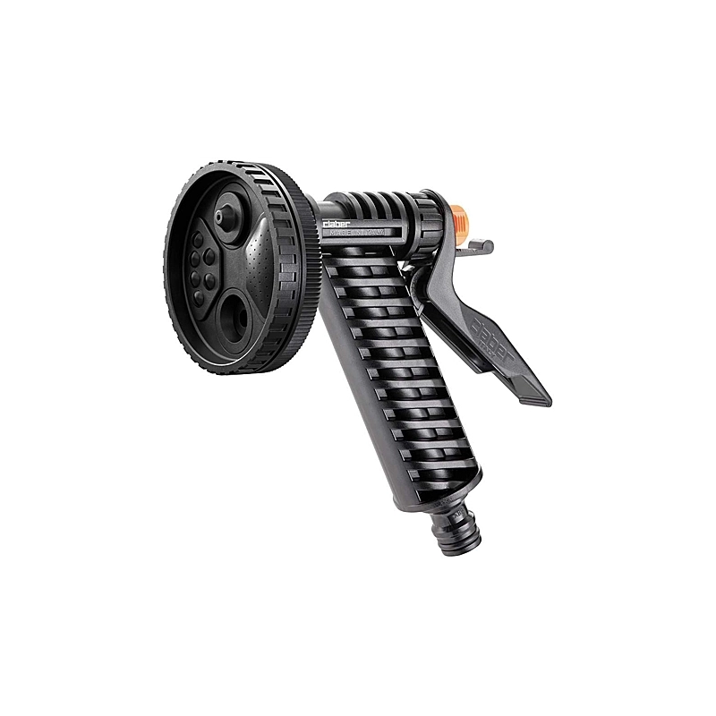 Pistola a doccia multigetto, con leva di regolazione del getto. Permette di scegliere tra 4 getti diversi, selezionabili ruotando la ghiera anteriore. In blister.