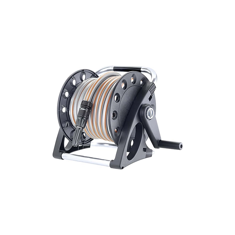 Avvolgitubo compatto da appendere alla parete oppure tra trasportare dove si desidera. Con 15 mt di tubo Silver Elegant Plus 12,5 mm, presa rubinetto 3/4'' con riduzione 3/4''-1/2'', 4 raccordi automatici (uno con acquastop) e 1 lanciaspruzzo.