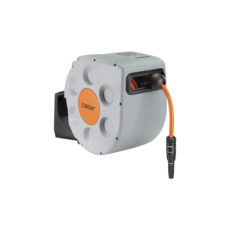 Avvolgitubo con riavvolgimento automatico, dotato di meccanismo Slow Rewind. Con 20 mt di tubo speciale indeformabile con super anti-attrito per un avvolgimento rapido. Supporto a muro con perno in alluminio inossidabile che permette di ruotare fino a 180 gradi. Dotato di prolunga per il collegamento al rubinetto, presa 3/4'', raccordi automatici e lancia a spruzzo.