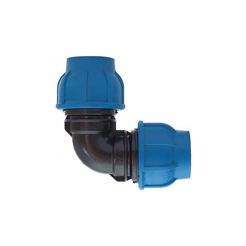Raccordo di giunzione a 90 gradi, con ghiere di fissaggio per tubo PN16. Modello = diametro tubo mm