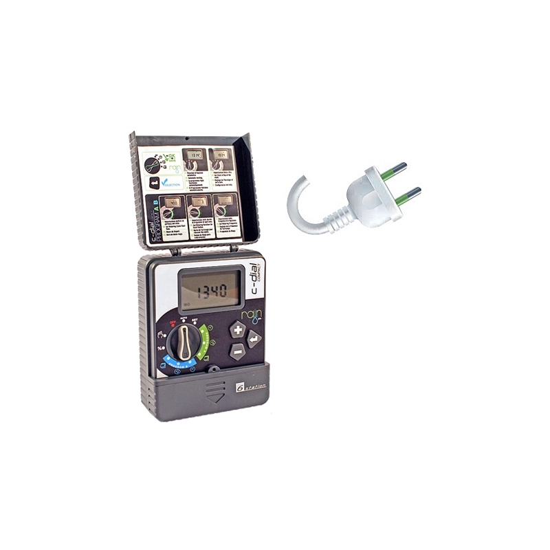 Centralina per interni con transformatore esterno 24 V AC. Batterie tampone 2x1,5 V AA non incluse per il mantenimento della memoria. Ingresso sensore pioggia. 2 programmi con 2 partenze per programma per settore al giorno da 1 a 7 giorni. Tempi di irrigazione da 1 a 240 minuti per stazione. Visualizzazione della prossima irrigazione. Regolazione stagionale da 10 a 200%. Modello = n. di stazioni
