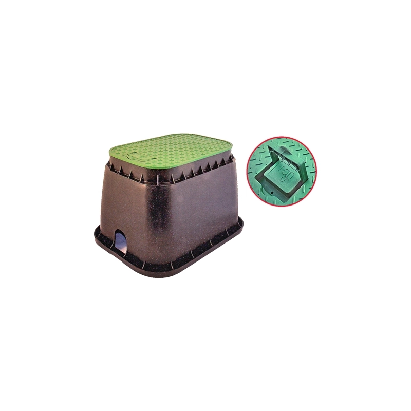 Pozzetto in polipropilene. Corpo nero e coperchio verde. Sistema brevettato con apertura a maniglia, con vite per chiusura coperchio anti vandalo. Supporto interno per centraline serie EVO. Modello = misure coperchio x altezza totale (l x l x h) cm