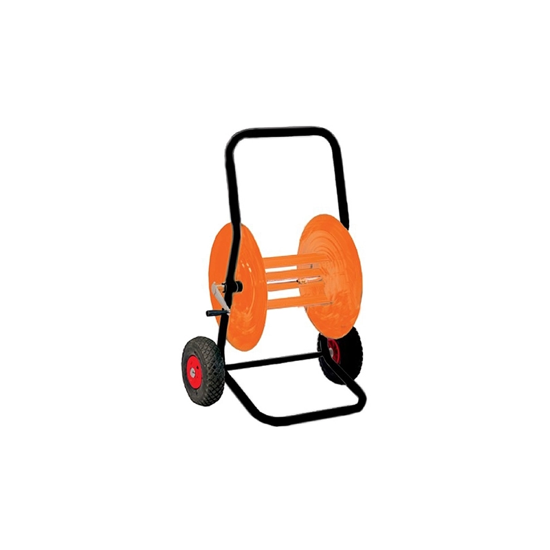 Avvolgitubo in acciaio con raccorderia in ottone. Con ruote pneumatiche con cuscinetti. Verniciatura epossidica. Capacita' m 80 di tubo irrigazione da 3/4"