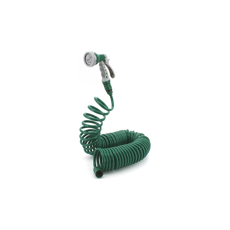 Pistola multigetto regolabile piu' tubo a spirale con attacco. Lunghezza 15 tubo mt. Attacco 3/4''