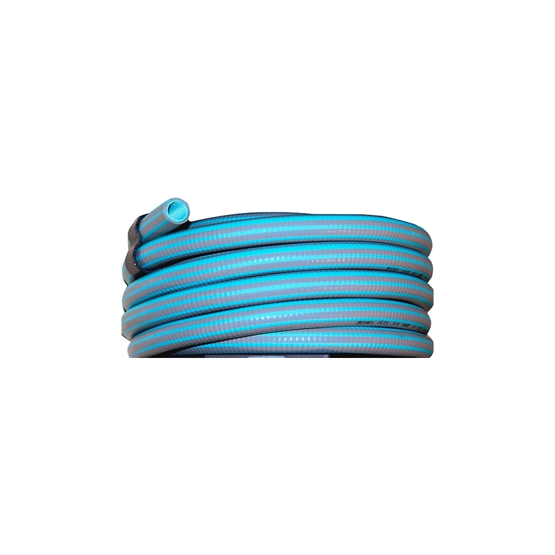 Tubo da giardino anti-torsione e anti-strozzo. Nuovo materiale atossico che garantisce l'uso per acqua potabile. Riciclabile al 100%. Attacco 5/8''. Pressione di utilizzo 4 bar. Pressione di scoppio 12 bar. Colore grigio con bande azzurre. Made in Italy. Modello = lunghezza mt