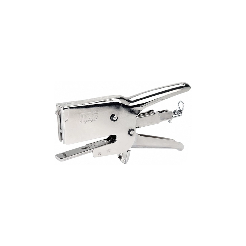 Cucitrice con corpo interamente in acciaio cromato ed impugnatura con fermo mano. Con 2 ribattitori. Adatta per graffe 73/6-12.