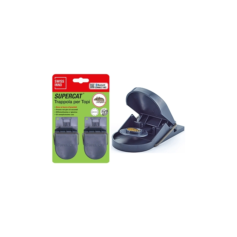 Trappola per topi provvista di esca e subito pronta all'uso. Caricamento facile e veloce. Eliminazione del roditore morto igienica e senza contatto. Per ambienti interni ed esterni. Disponibile esca come ricambio. Modello = confezione
