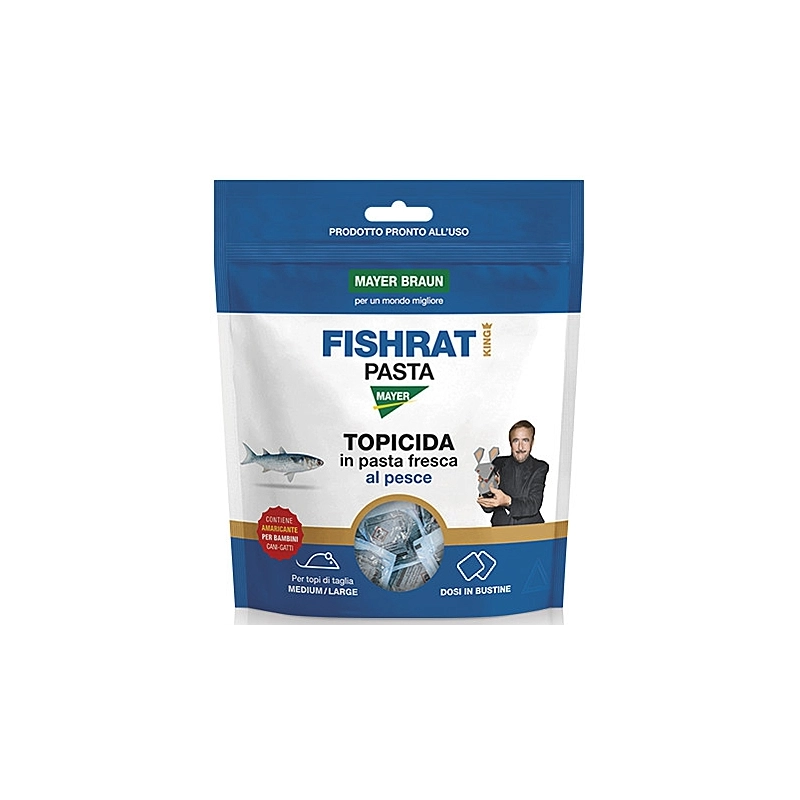 Esca in pasta con aromatizzazione al pesce. Principio attivo: BRODIFACOUM. Concetrazione 0,0025% secondo le normative vigenti. Per topi di taglia M, L. Contenuto 150 gr.