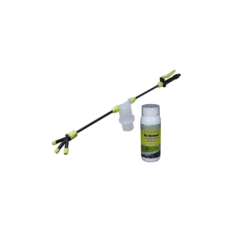 Kit composto da 1 lancia con 3 ugelli regolabili e 1 insetticida concetrato BIO REVANOL (indicato per combattere le forme adulte di diversi insetti: zanzare, zanzare tigre, mosche, ecc..) da 500 ml. La lancia funziona versando il principio attivo nel serbatoio (50 ml) e collegando l'erogatore ad un tubo da giardino. Il getto arriva fino a 5 mt in modo da poter raggiungere ogni angolo del giardino.