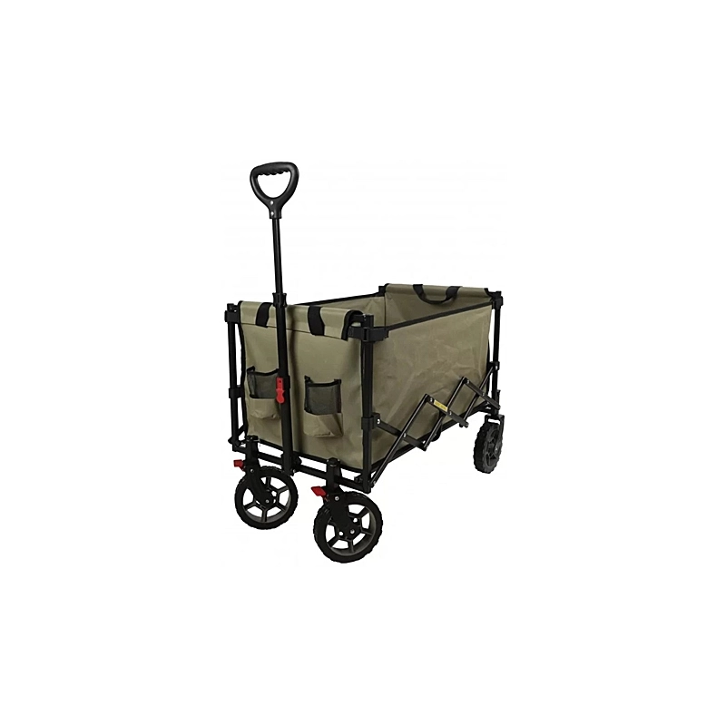 Carrello pieghevole con 4 ruote. Tessuto in poliestere 300D. Portata 80 kg. Dimensioni 90x50x96 cm. Colore kaki.