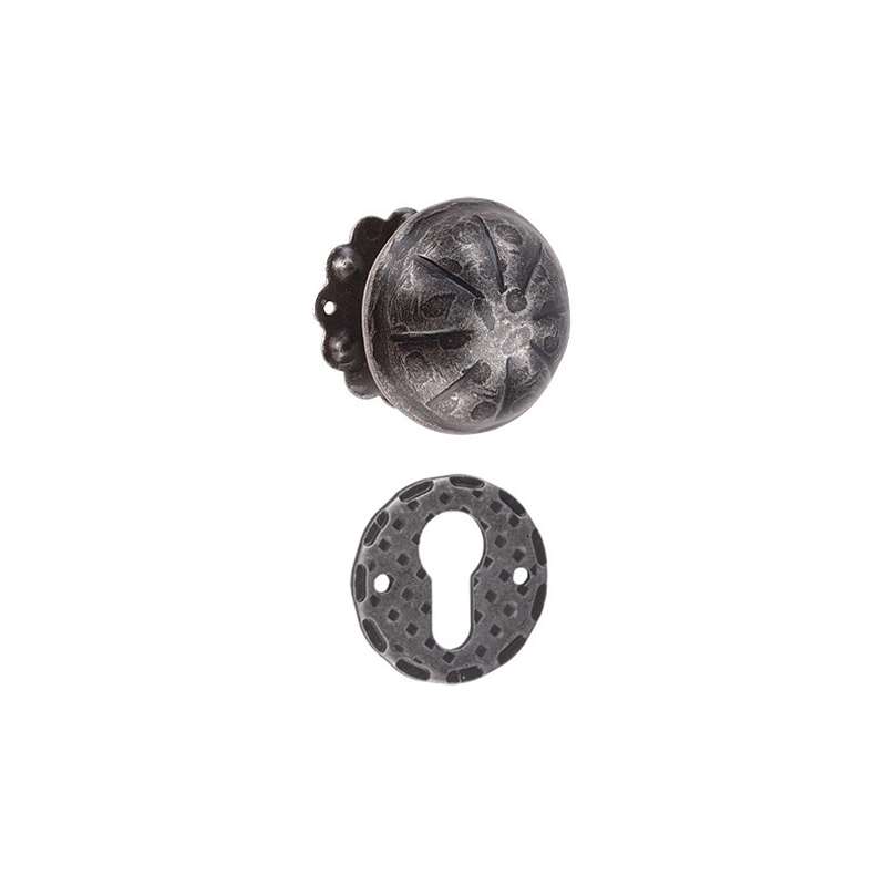 Pomolo fisso maggiorato con rosetta e bocchetta. Color argento. Foro Yale.