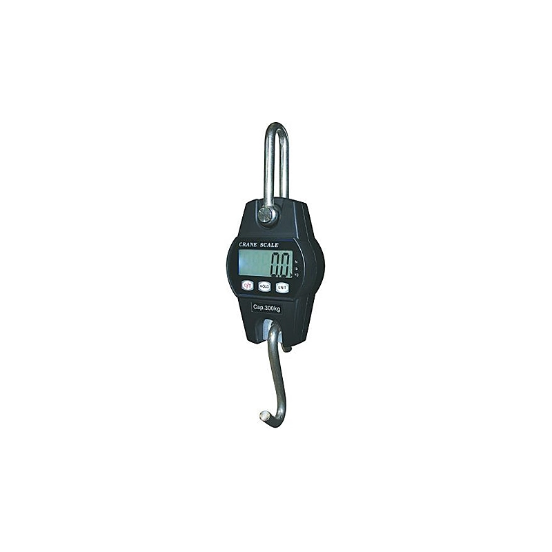 Corpo in ABS con doppio gancio in acciaio. Scala di misurazione chilogrammi-libbre con divisione di pesata pari a 50 gr fino a 100 kg e 100 gr fino a 300 kg. Funziona con 2 batterie stilo incluse. Portata kg 300