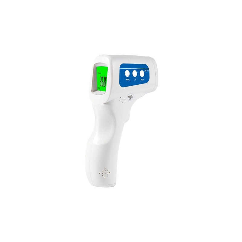 Termometro a infrarossi con rilevamento della temperatura corporea immediato e a distanza di sicurezza. Dispositivo per uso medicale. Schermo LCD a 3 colori. Memoria per le 32 misurazioni precedenti. Dispositivo medico conforme Direttiva 93/42/EC. Alimentazione 2xAA (non incluse). Dimensioni 155x100x40 mm.