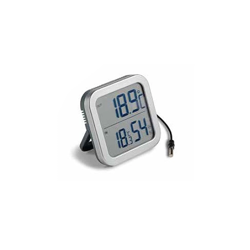 Per interni ed esterni. Funziona con 1 batteria AAA inclusa. Dimensioni 80x80 mm. Con sonda a cavo da 3 mt. Con memoria minima/massima.