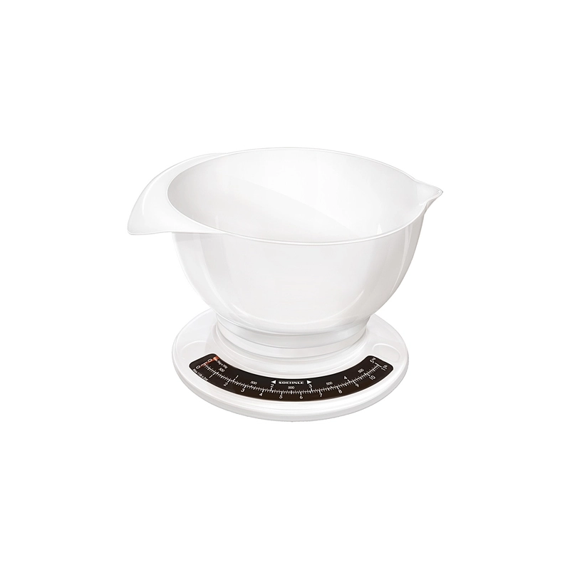 Bilancia da cucina con ampia ciotola rimovibile con impugnatura e beccuccio per versare di capacita' 2,5 lt. Funzione tara meccanica. Molto facile da pulire. Portata 5 kg. Divisione pesata 50 gr. Colore bianco. Dimensioni 26,5x26,5x18h cm