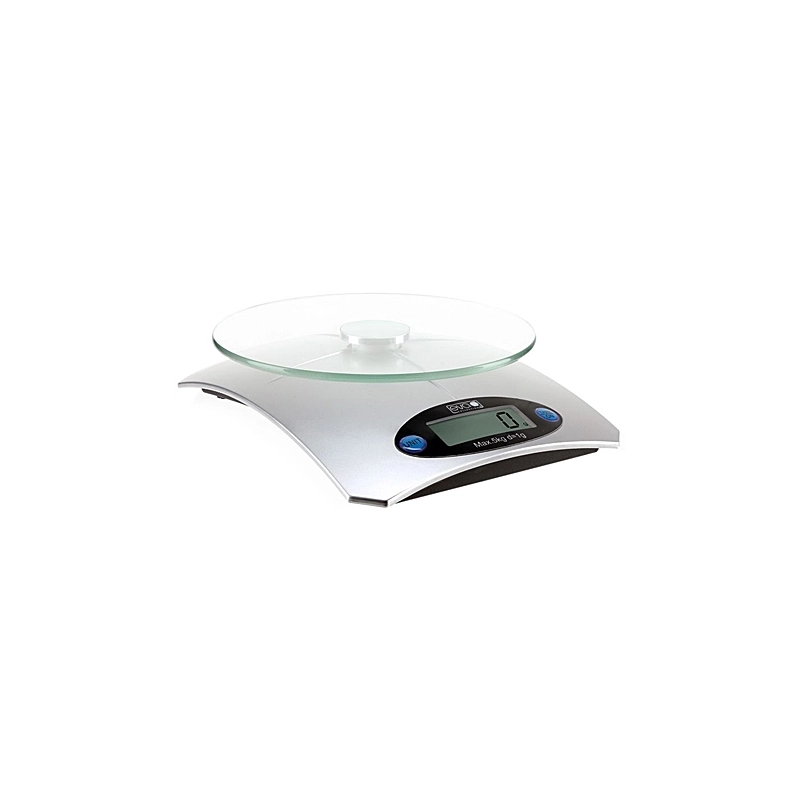 Bilancia digitale con piatto di pesata in vetro con funzione tara e autospegnimento. Display 62x28 mm. Dimensioni mm 155x45x205. Portata max kg 5. Portata minima gr 1. Indicatori di errore e di esaurimento batterie. Funziona con 3 pile AAA