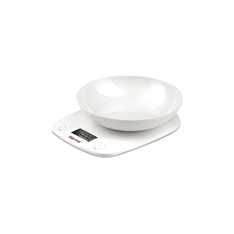 Bilancia digitale con piatto di pesata rimovibile, con funzione tara. Display LCD. Colore bianco. Dimensioni mm 180x210x55h. Portata max kg 5. Portata minima gr 1. Funziona con 2 pile AAA da 1,5V.