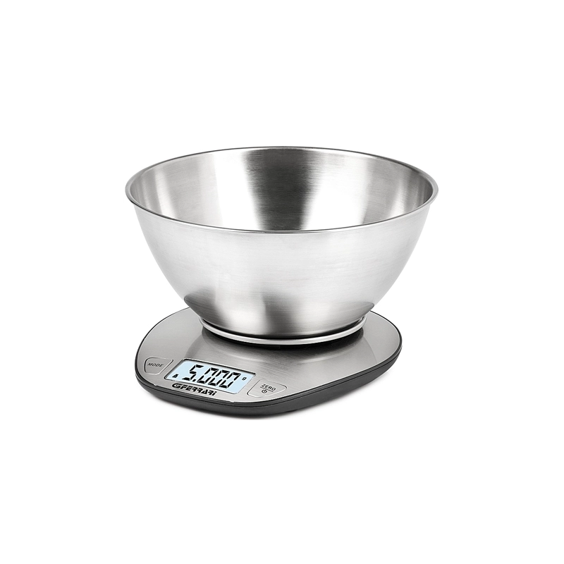 Bilancia elettronica da cucina con ciotola in acciaio inox. Display LCD retroilluminato. Portata 5 kg. Divisione 1 gr. Dimensioni 180x130x195 mm. Funzioni: tara, spegnimento automatico, selezione g o ml. Funziona con 2 batterie AAA da 1,5V.