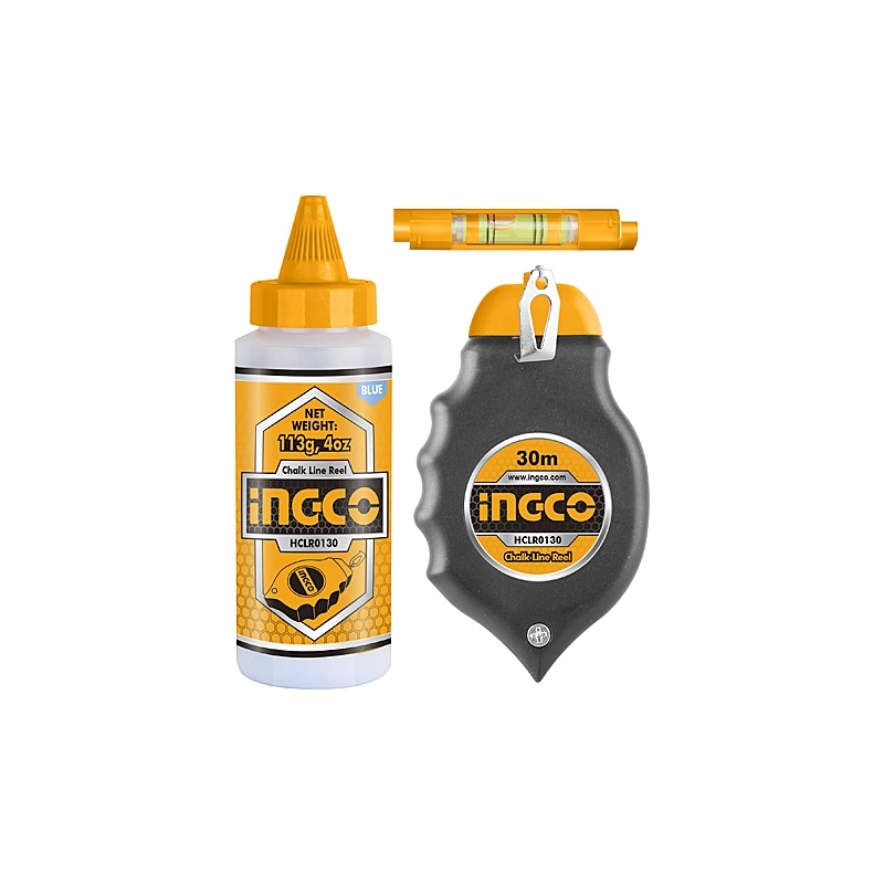 Impugnatura ergonomica. Lunghezza filo m 30. Completo di bottiglia da gr 113 di polvere tracciante e 1 livella.