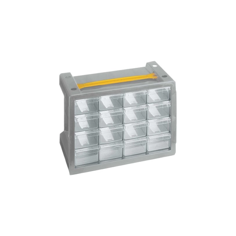 Cassettiera sovrapponibile ad incastro, trasportabile, dotata di 16 cassetti, completa di 10 divisori mobili. Dimensioni (L x P x H) mm. 279 x 150 x 195