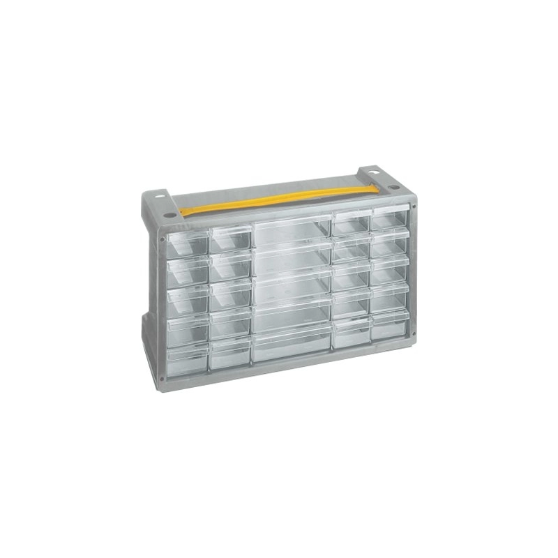 Cassettiera sovrapponibile ad incastro, trasportabile, dotata di 25 cassetti, completa di 20 divisori mobili. Dimensioni (L x P x H) mm. 405 x 150 x 240