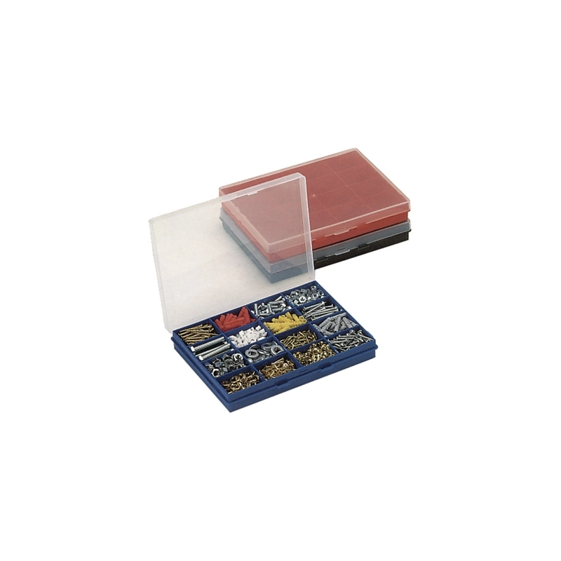 Organizer a 16 scomparti con coperchio trasparente. Dimensioni (L x P x H) mm. 243 x 186 x 38