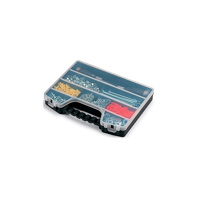 Organizer a 9 scomparti con coperchio trasparente a doppia chiusura. Dimensioni (L x P x H) mm 325 x 250 x 50