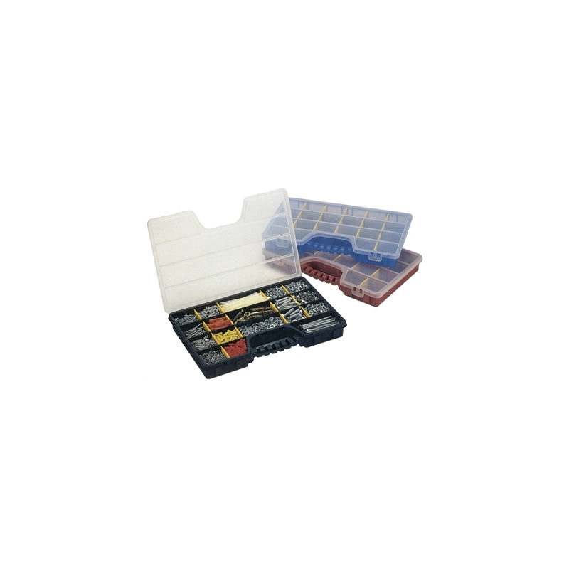Organizer a 5 scomparti con coperchio trasparente a doppia chiusura. Dotato di 12 divisorie mobili. Dimensioni (L x P x H) mm 510 x 330 x 60