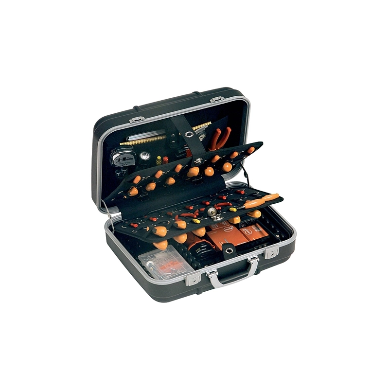 Valigia portautensili professionale in policarbonato e ABS, antiurto ed ad alto spessore. Tasca portadocumenti. 1 pannelli portautensili con elastici o tasche. Fondo termoformato in polistirolo con scomparti modulabili e 2 portaminuterie. Maniglia in ABS satinato con impugnatura morbida, ergonomica e antiscivolo. Modello = dimensioni cm/numero cartelle interne